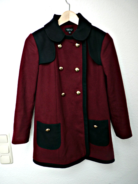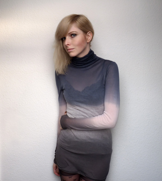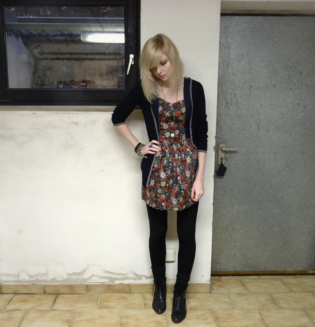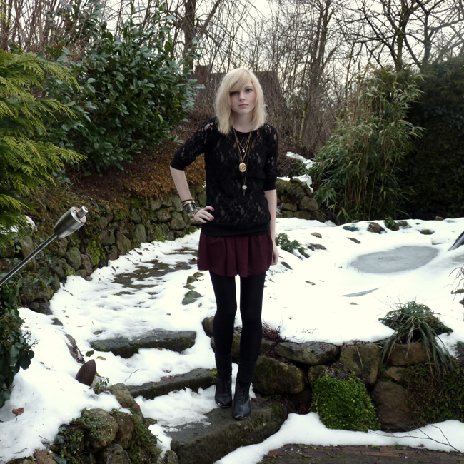 das ergebnis ist ein shirt mit vielen großen und kleinen knöpfen, ein paar nieten, rissen, dazwischen gewebten stoffstreifen und schleifen. der rock ist übrigens von topshop und das viech im haar habe ich ja letztens bei primark gekauft.